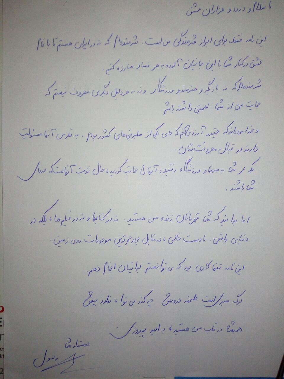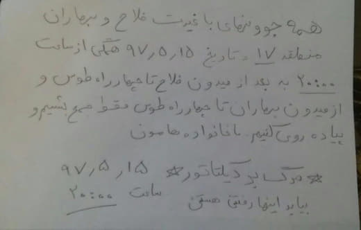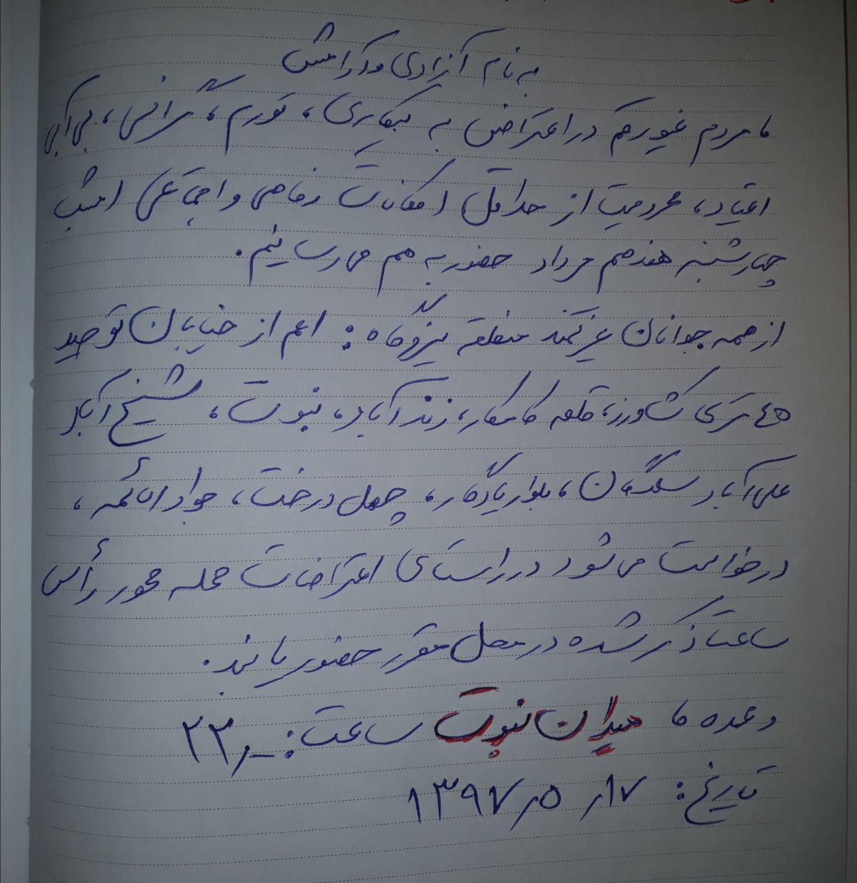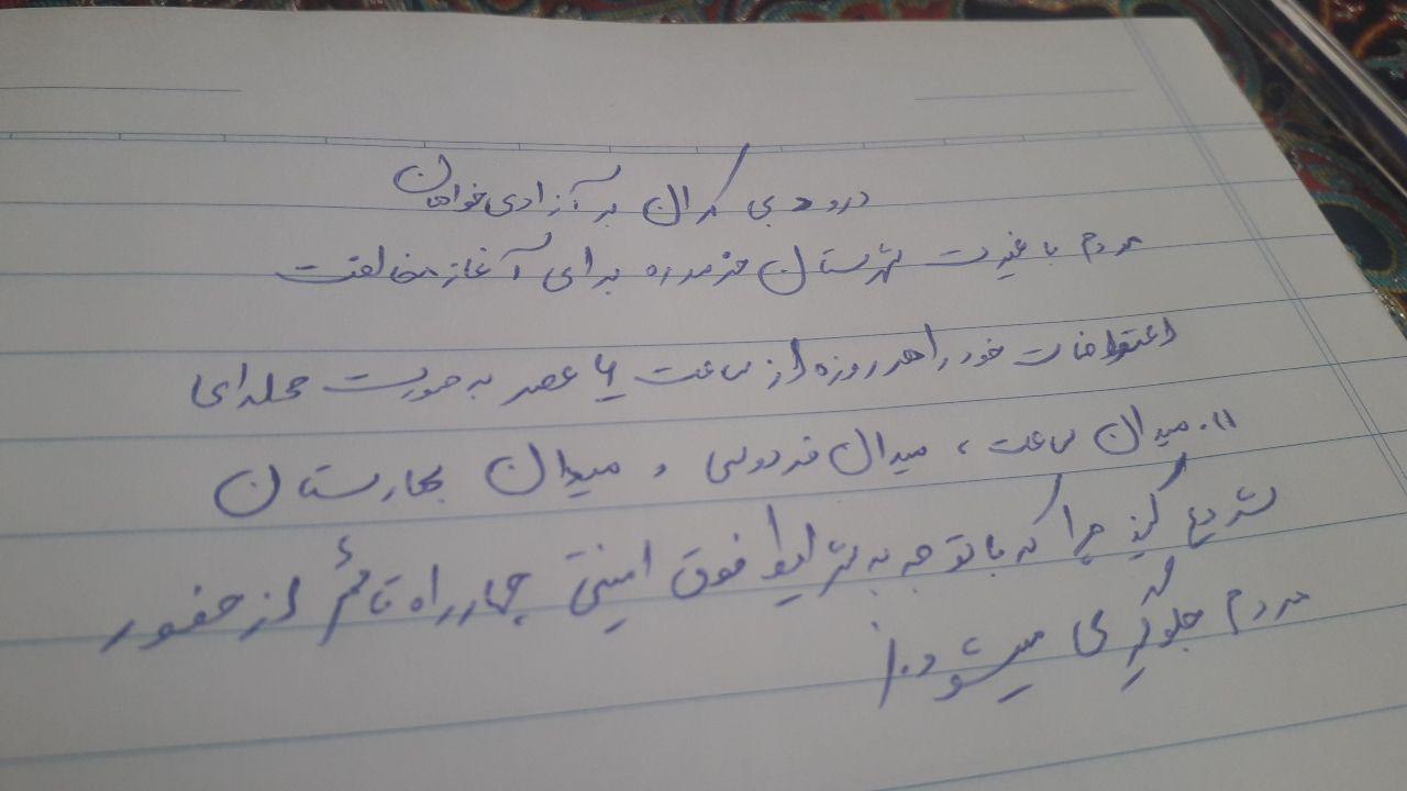 هم اكنون كه اين طومار امضا میشود او نزدیک به صدوبيست روز در اعتصاب به سر میبرد و سطح هوشياری او به مرحله بحرانی رسيده و طبق نظر پزشكان در صورت ادامه اعتصاب كمتر از ده روز ديگر زنده میماند.
