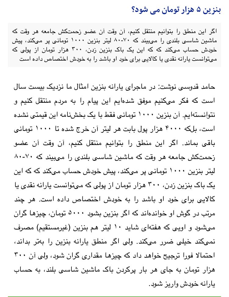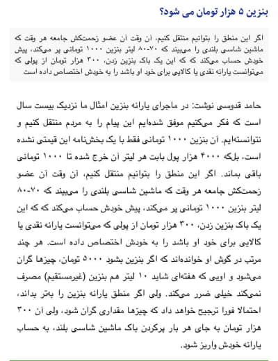 رفتم پمپ بنزین، صف بود، بیشتر از صد متر، بعد از ۲۰ دقیقه که آنجا بودم و دیدم حرکتی ندارد، سؤال کردم، و تازه فهمیدم پمپ بنزین اصلا بنزین ندارد. مردم ایستادهاند تا بنزین برسد! چقدر خندیدم. چه جالب!