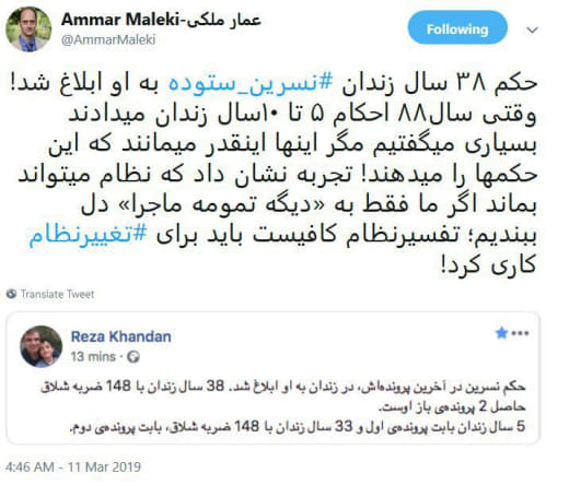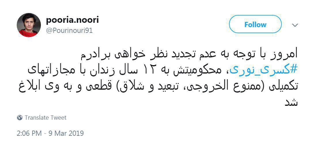 ۲- کسری نوری: ۱۲ سال حبس، ۷۴ ضربه شلاق، ۲ سال تبعید، ۲ سال محرومیت اجتماعی و رسانهای، ۲ سال ممنوعیت خروج از کشور