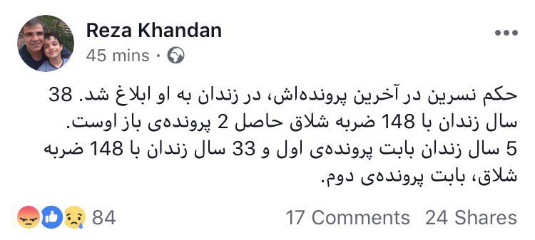 ۵- رضا انتصاری: ۷ سال حبس، ۷۴ ضربه شلاق، ۲ سال تبعید، ۲ سال محرومیت اجتماعی و رسانهای، ۲ سال ممنوعیت خروج از کشور