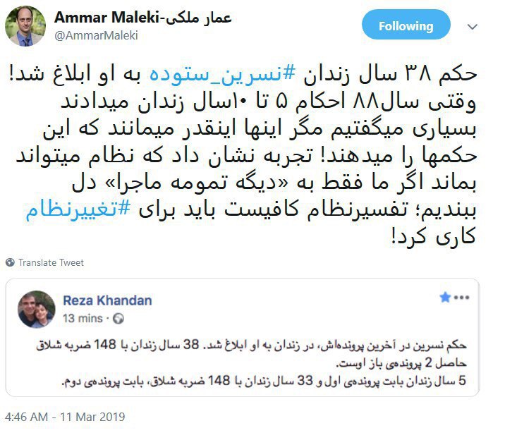 ۳- محمد شریفیمقدم: ۱۲ سال حبس، ۷۴ ضربه شلاق، ۲ سال تبعید، ۲ سال محرومیت اجتماعی و رسانهای، ۲ سال ممنوعیت خروج از کشور
