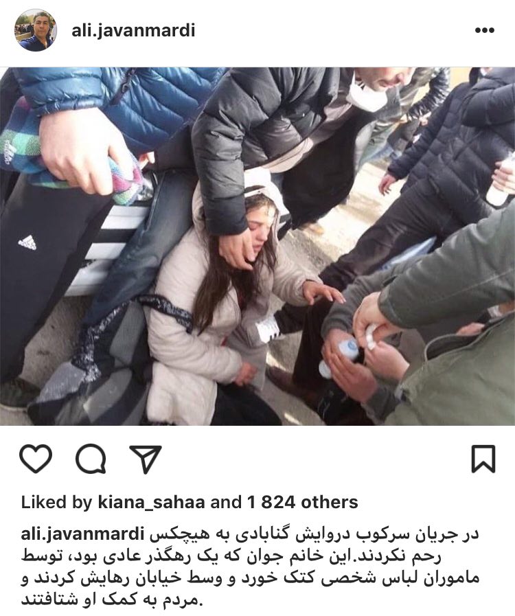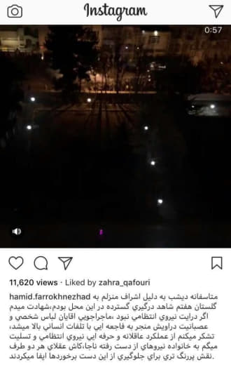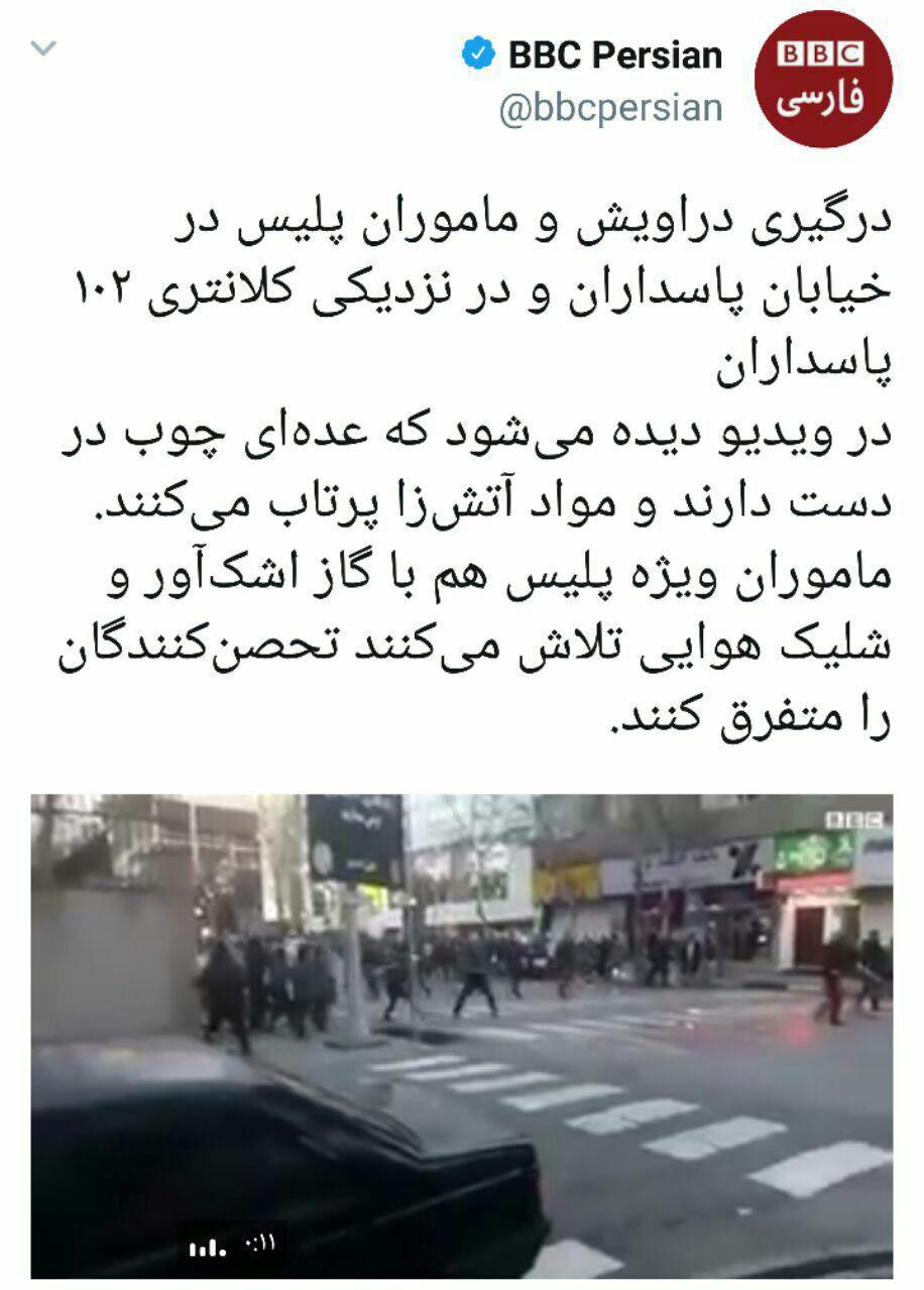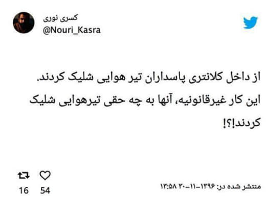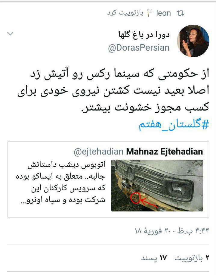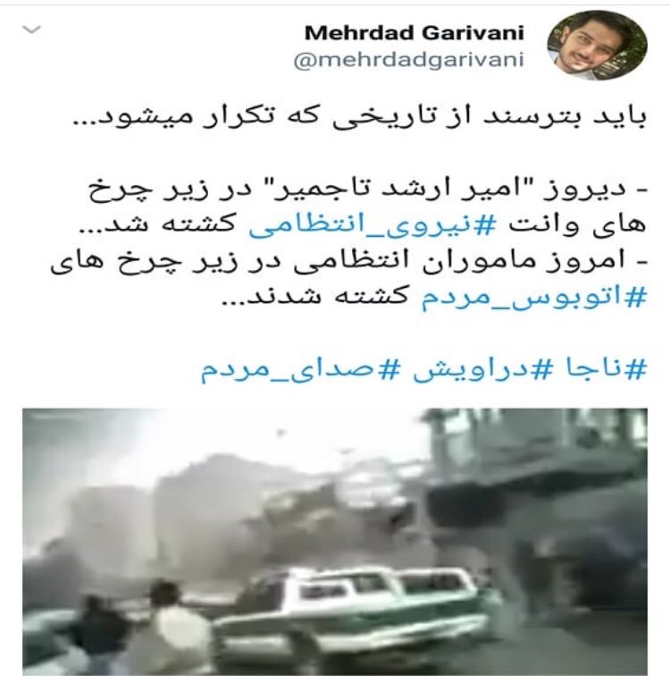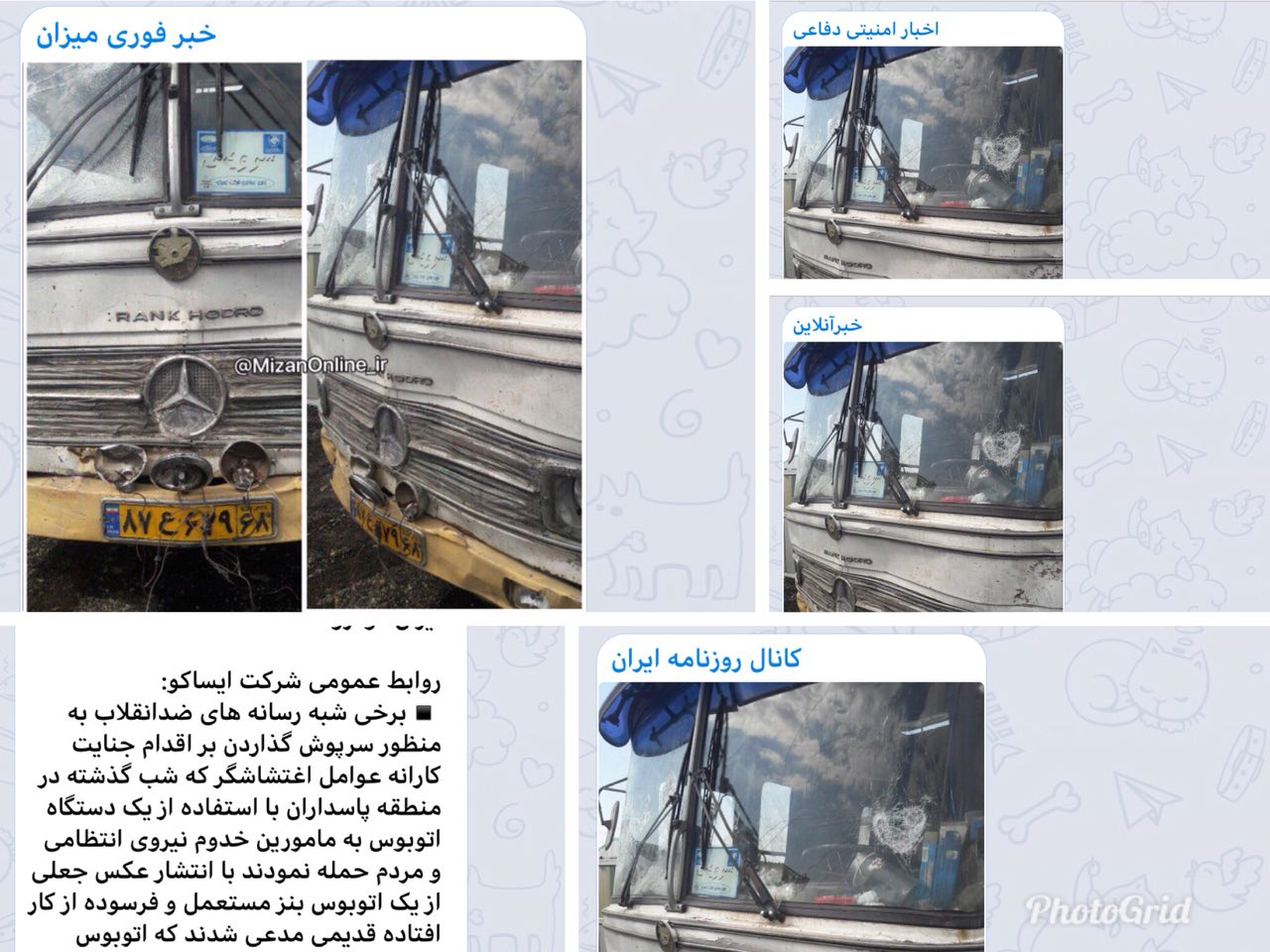 آلت قتاله {اتوبوس} که سوراخهای روی شیشه آن نشان از شلیک رگباری با سلاح جنگی دارد و نه شلیک ساچمهای که سلاح مورد استفاده در اعتراضات است چگونه در شهر گردانده میشود؟ چگونه یک موتور سوار که احیاناً فیلمبردار مجزایی هم در ترک آن نشسته است و مشغول فیلم برداری بدون استرس است، اجازه یافته به راحتی این تصویر را ضبط کند.