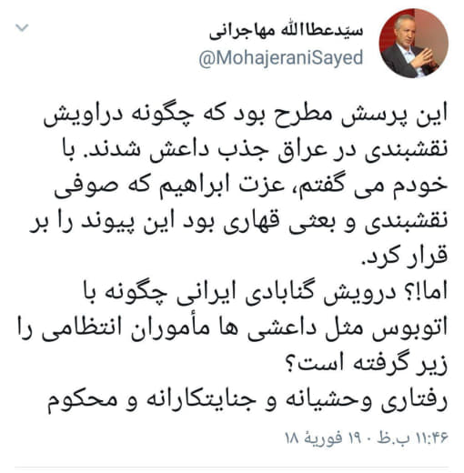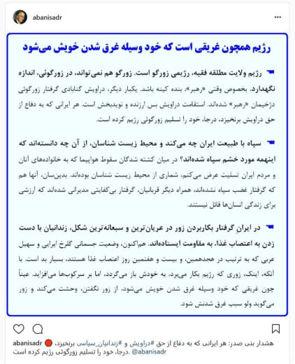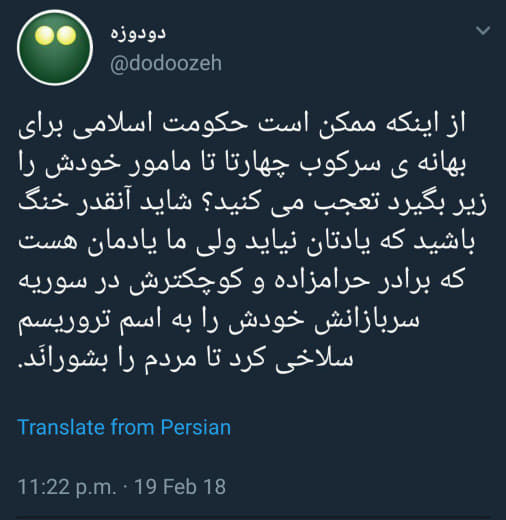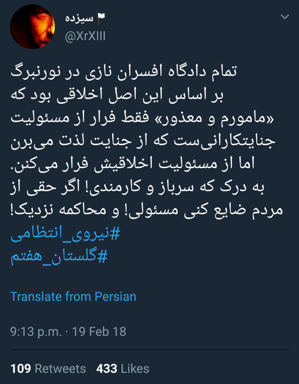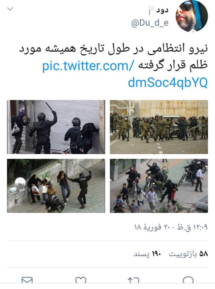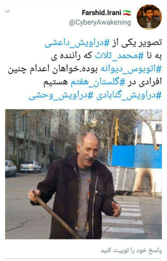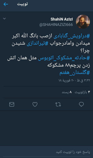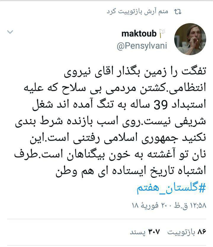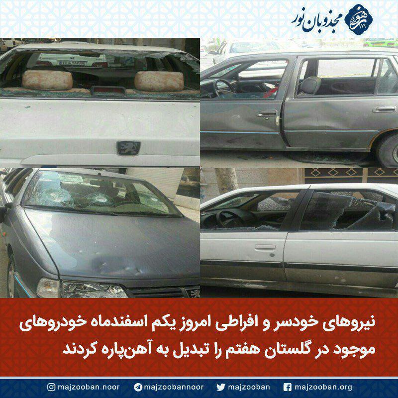 آلت قتاله {اتوبوس} که سوراخهای روی شیشه آن نشان از شلیک رگباری با سلاح جنگی دارد و نه شلیک ساچمهای که سلاح مورد استفاده در اعتراضات است چگونه در شهر گردانده میشود؟ چگونه یک موتور سوار که احیاناً فیلمبردار مجزایی هم در ترک آن نشسته است و مشغول فیلم برداری بدون استرس است، اجازه یافته به راحتی این تصویر را ضبط کند.