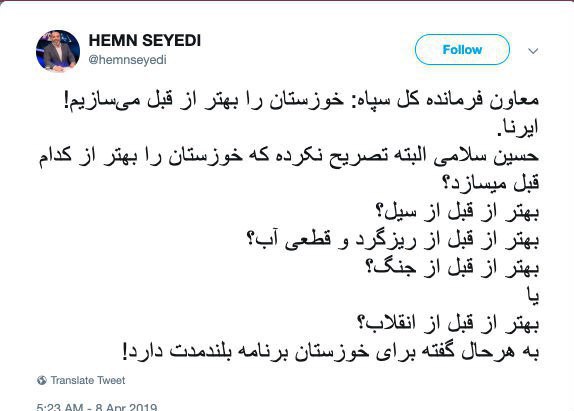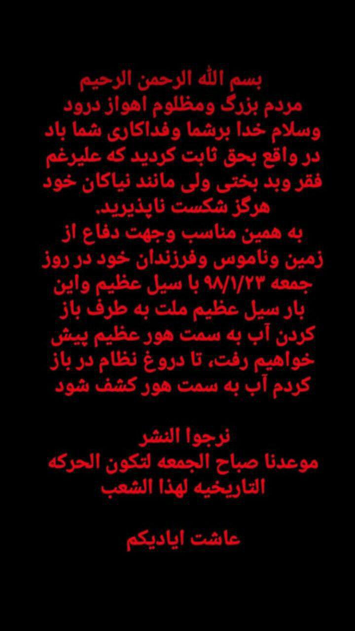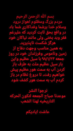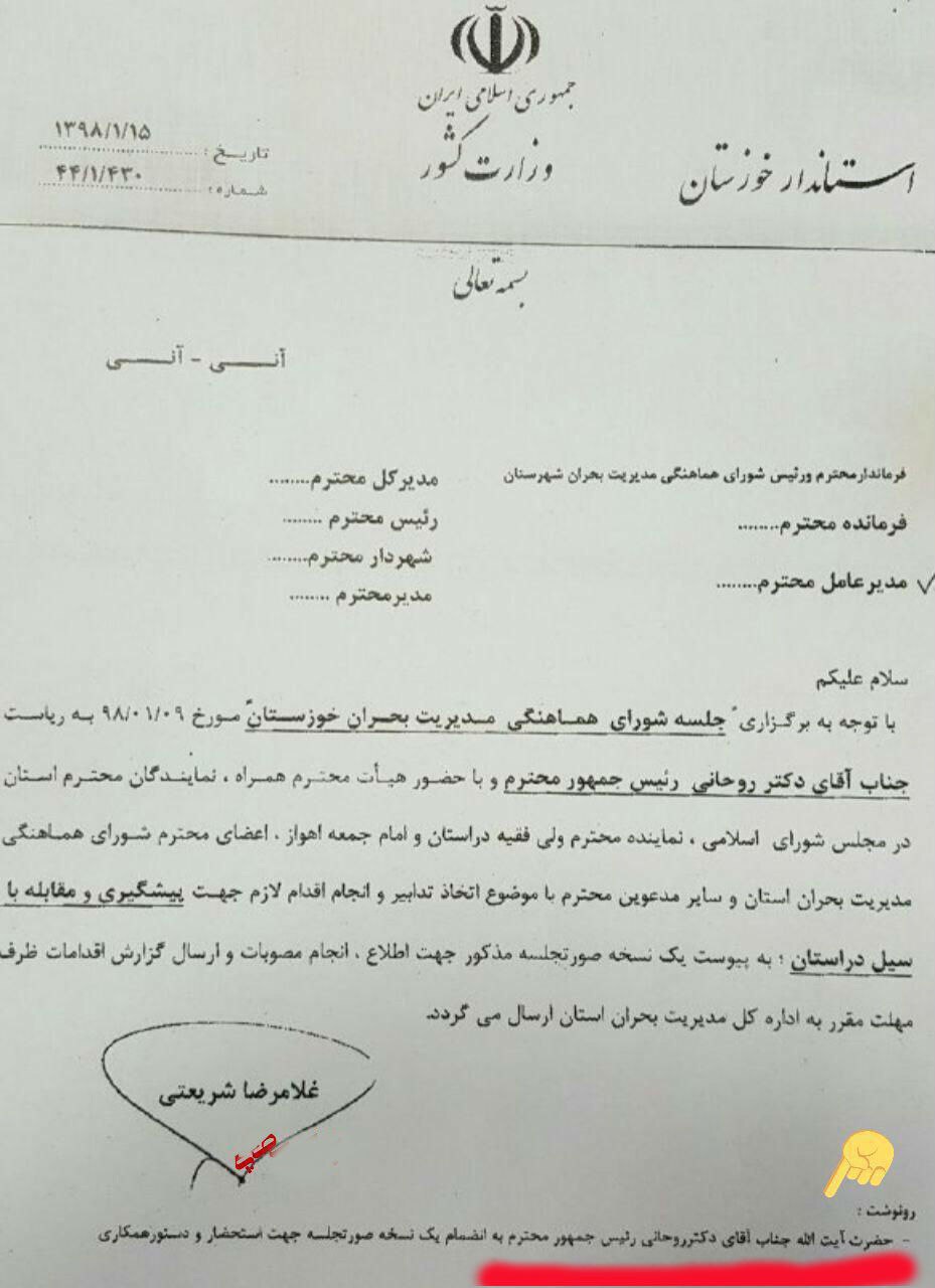 از هفته گذشته دولت اعلام کرد که شهرهای خفاجیه، حمیدیه، شوش، بستان و روستاهای اطراف این شهرها به زیر آب خواهند رفت. پلیس و نیروی انتظامی را به میان مردم فرستادند تا این مناطق را تخلیه کنند. اقدام پلیس و دولت و طبل ۲۴ ساعته رسانههای حکومتی جهت ترساندن مردم و به تبع آن تخلیه این نقاط نشاندهنده ضعف دولت نبود، بلکه منعکس کننده برنامهریزی و اولویتبندی بود که بر روی میزی هیأت دولت و استاندار قرار داشت و مصوب جلسه هیأت بحران به ریاست حسن روحانی در استان خوزستان بود.